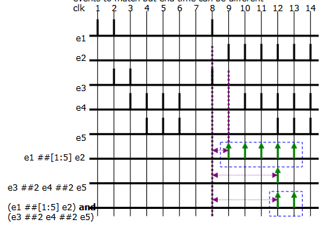 A concise description of complex behaviour: After request is asserted, acknowledge must come 1 to 3 cycles later.